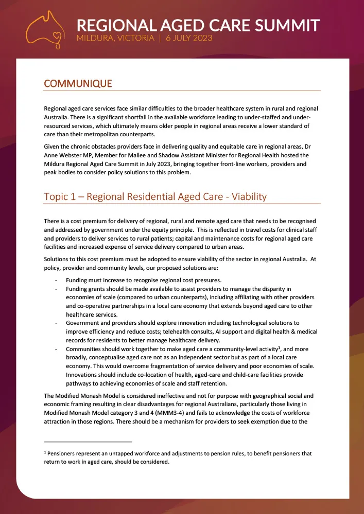 Regional aged care services face significant workforce shortages, leading to lower care standards compared to metropolitan areas. In July 2023, Dr Webster hosted the Mildura Regional Aged Care Summit, bringing together front-line workers, providers, and peak bodies to explore solutions. The high costs and vast distances in remote Australia demand targeted government support beyond a one-size-fits-all approach. Feedback from the Summit will inform a comprehensive Regional Aged Care Policy, as you can see below as part of the Aged Care Summit Report.